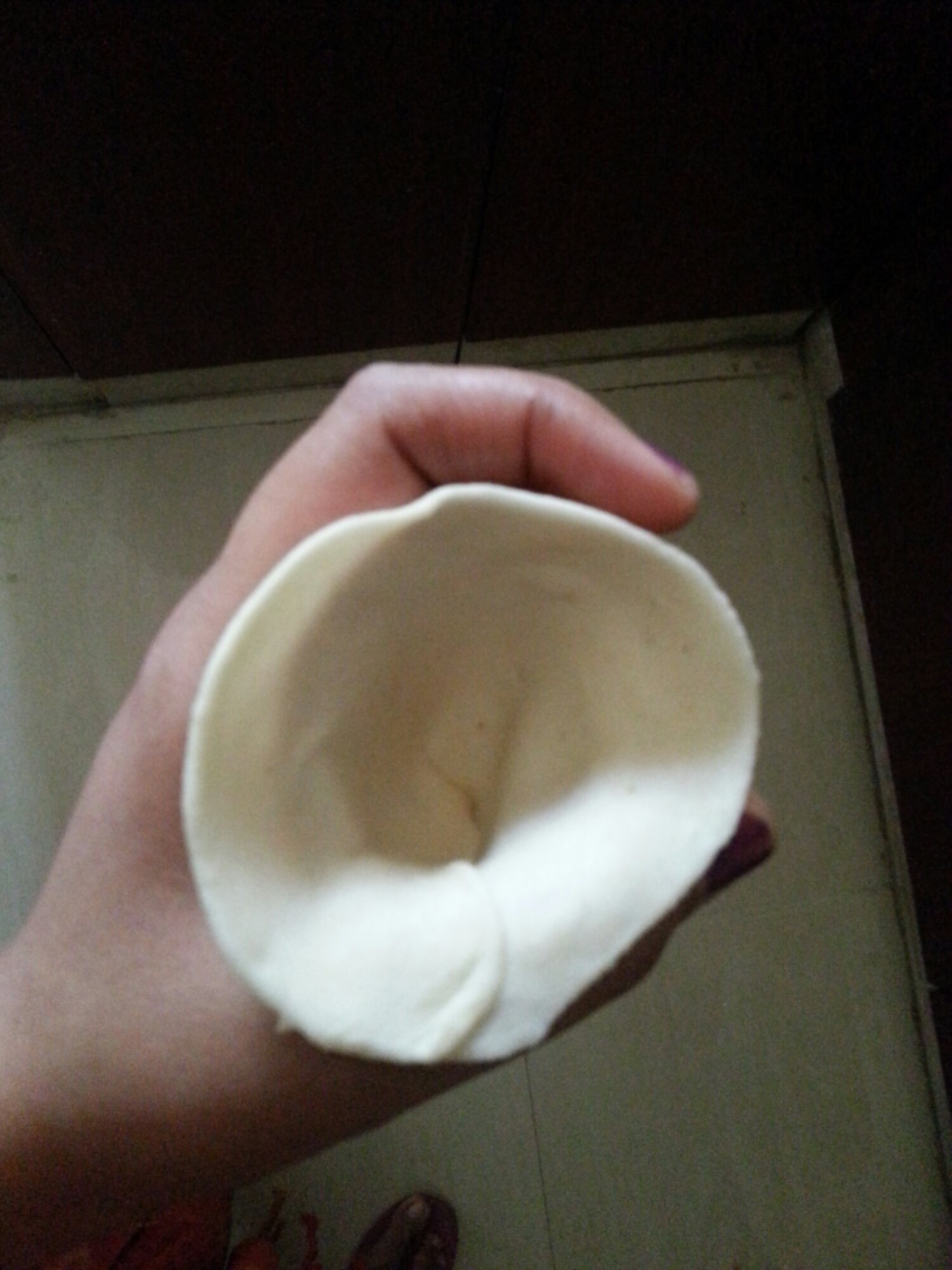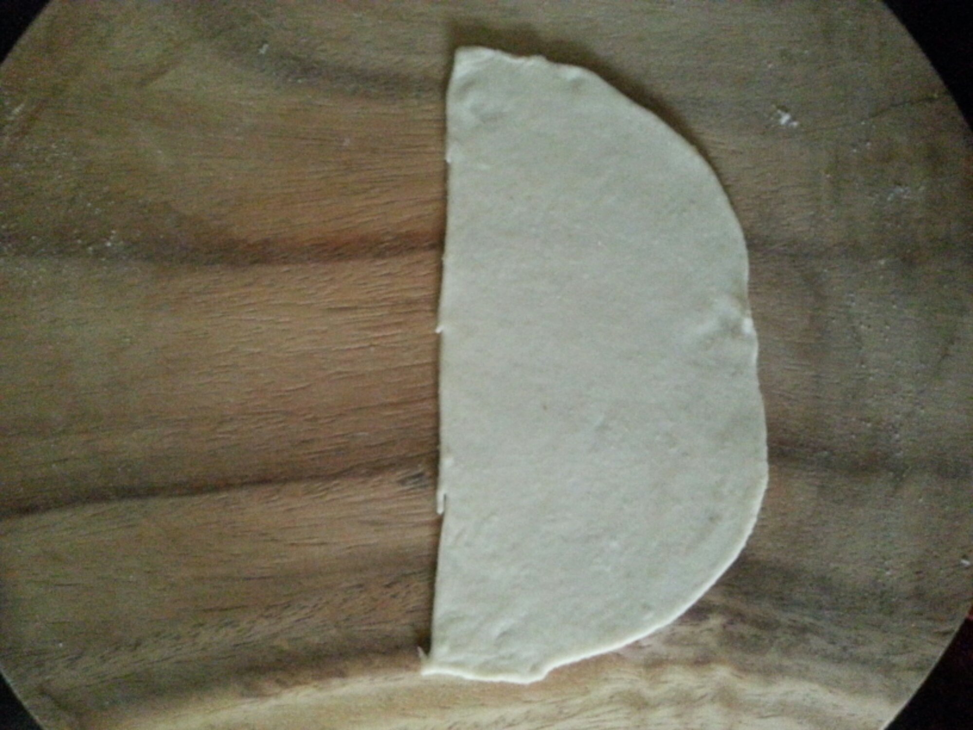 Knead the mixture of flour, salt and ghee with water into soft yet firm dough. Now make small balls of the dough and roll then in to circles. Cut these circles in to semi circles and then join them along the diameter to form a coffee. Fill then with the stuffing. Ensure to leave some space for folding and sealing them at the base. I used water to seal the edges, dough should be thick enough to hold the stuffing.