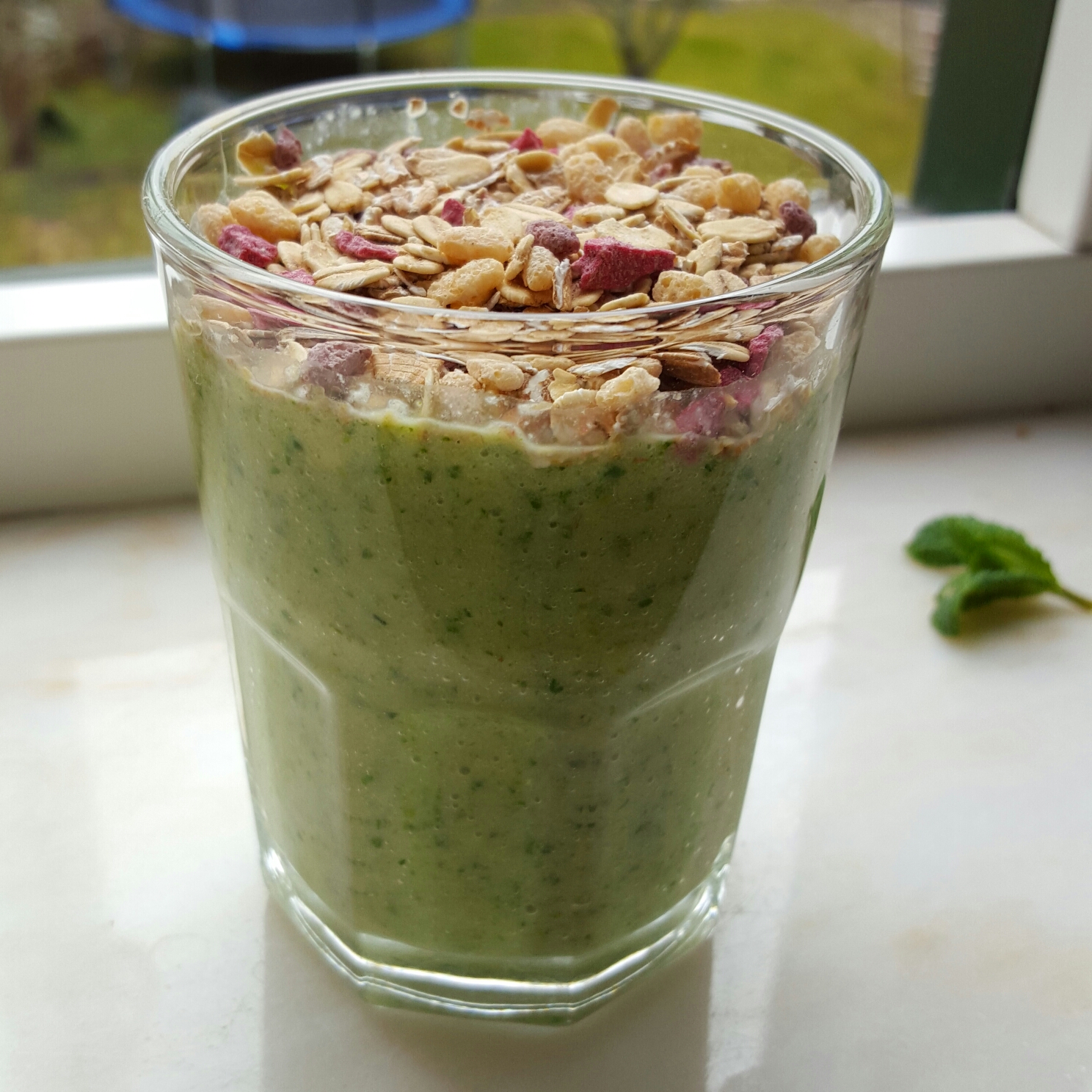 Blend 1 and half inch cucumber, 1 banana, 2 inch zucchini, 3 frozen blocks of spinach, 4 to 5 almonds, 5 – 6 mint leaves, 100ml coconut milk. If you still wish, you can add any sweetner!