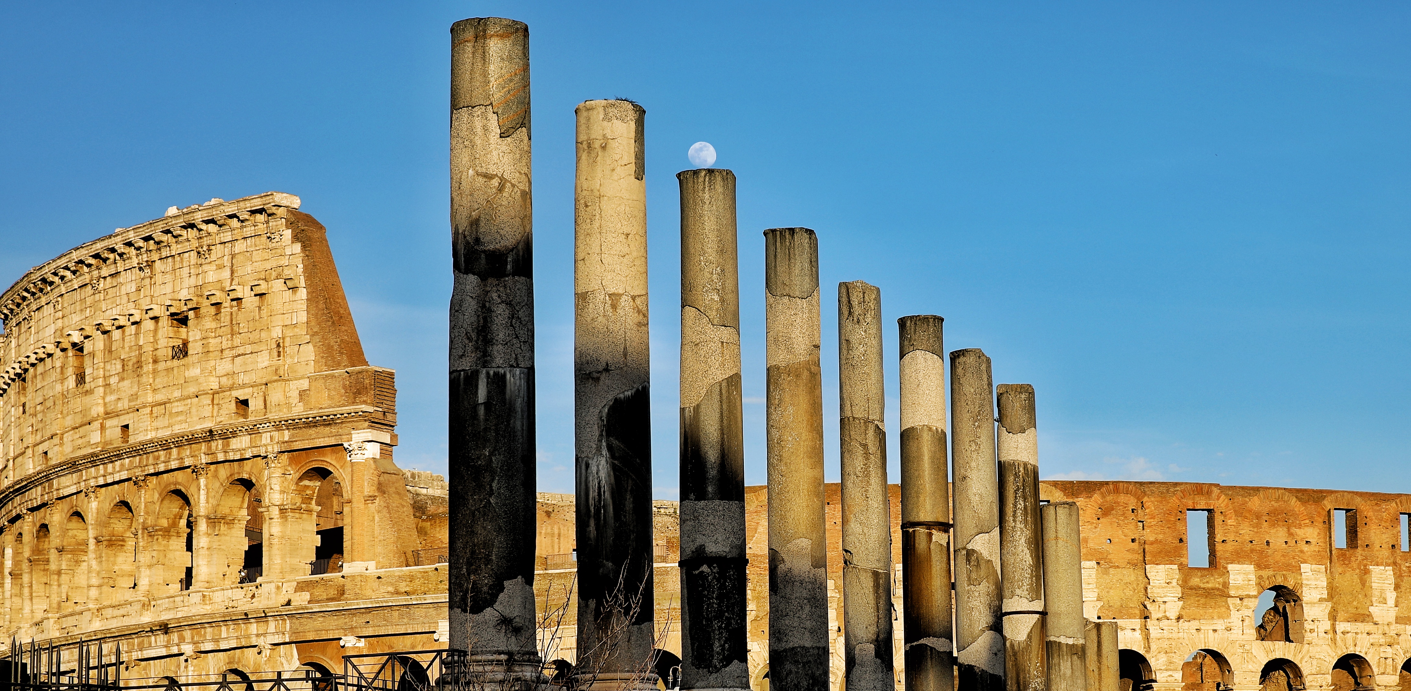 We walked a little farther towards the archaeological sites, to find the moon rise over Colosseum. We framed it with these columns.