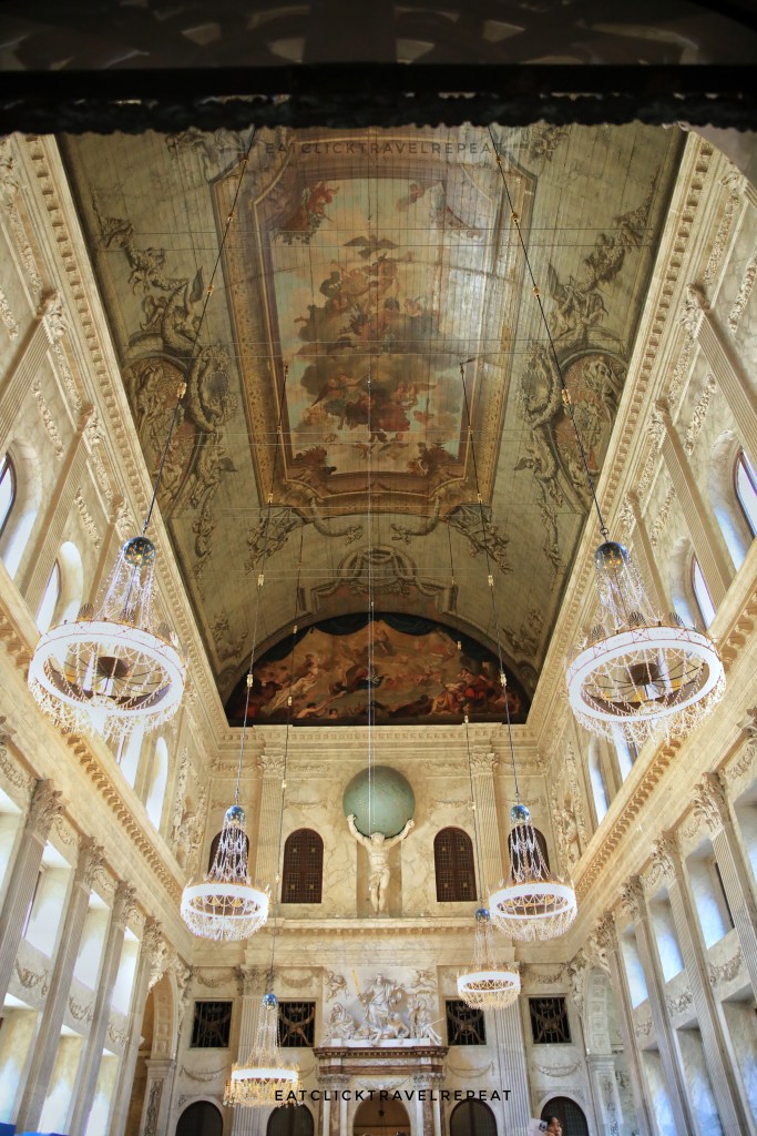 On the floor of the hall are maps off the world with celestial hemispheres.