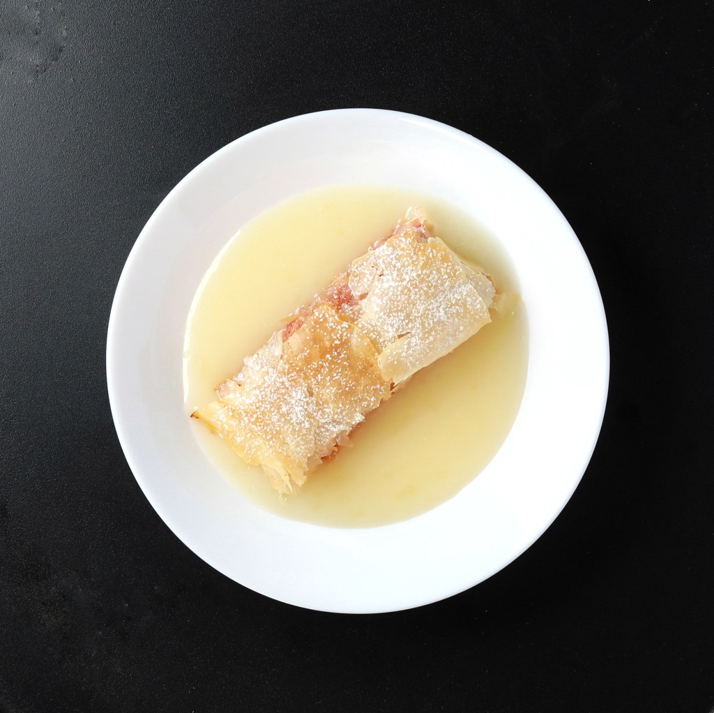 Brush the entire pastry with remaining butter. Place the pastry in the baking tray in such a manner that the folds of the Strudel are on the bottom side touching the tray.