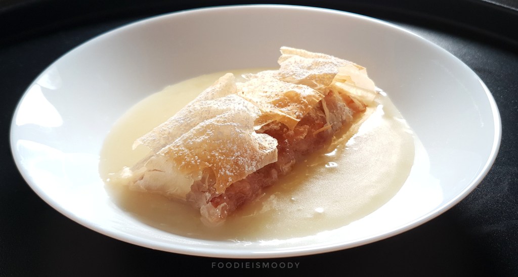 Bake the Strudel until its golden brown in colour. Let the strudel cool after 30 minutes of baking. I checked if the apples were cooked by sticking a skewer in between. Remove the pastry on a cutting board and sprinkle it with powdered sugar. Serve it with apple sauce. I thought the first layer was super flaky but I didn’t mind.