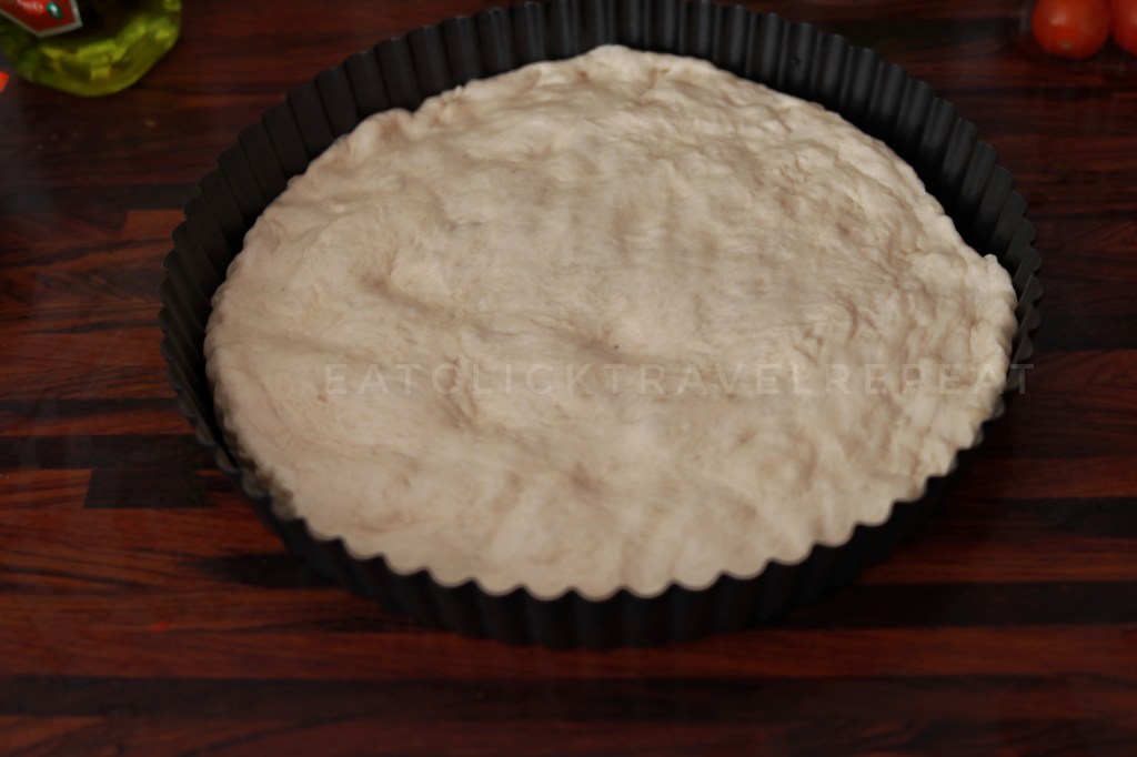 • Before I spread the dough, I applied a little bit of olive oil at the base of the pan I am going to use for baking. I chose a circular pan, since that’s what I had, though ideally Focaccia are made in rectangular pans.