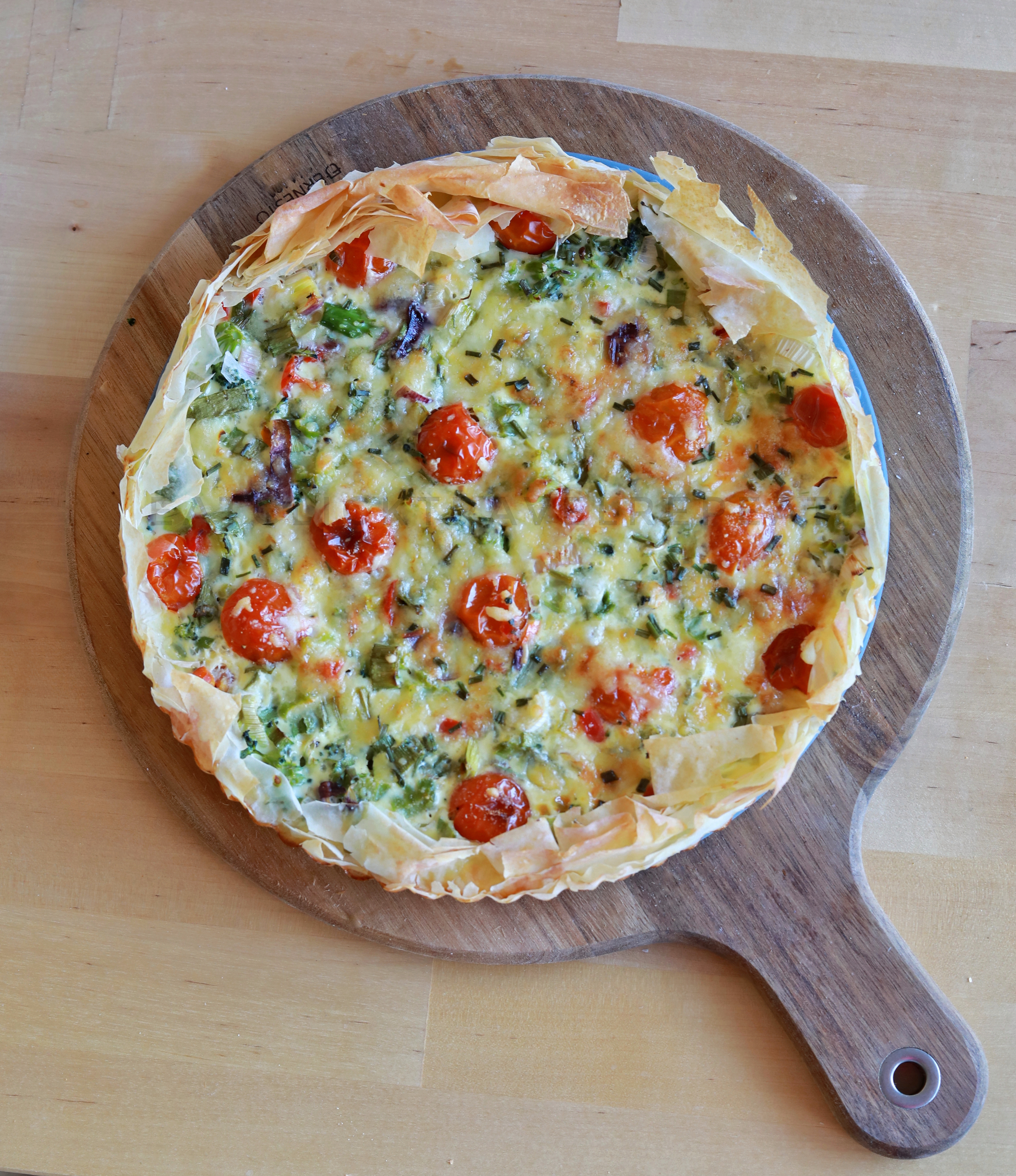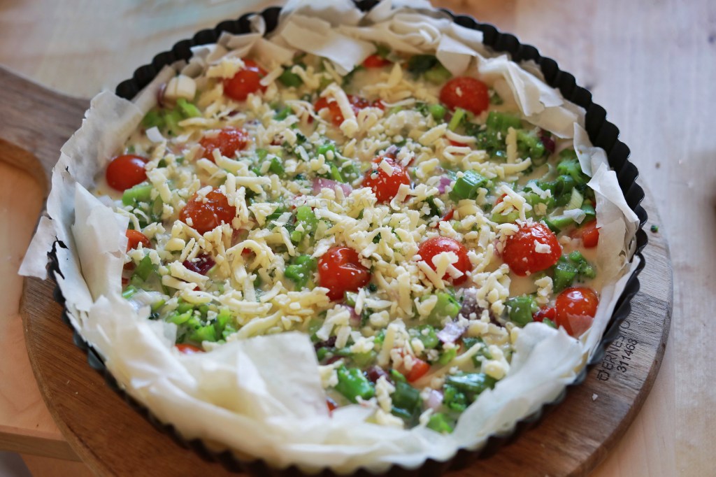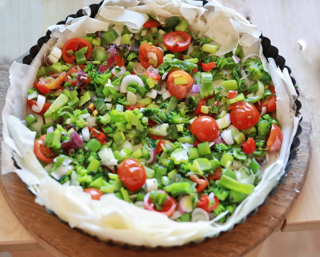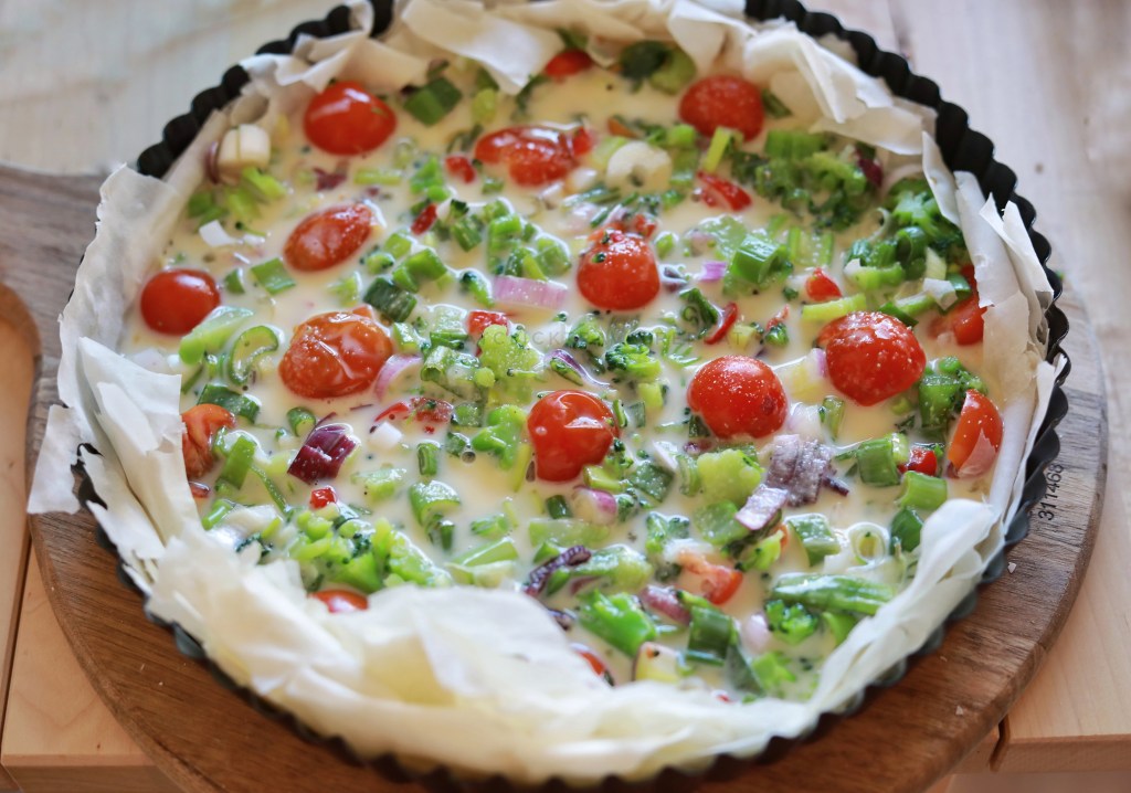 I prepared the quiche pan by laying atleast 8 filo sheets at the bottom. Then pour the vegetables on top of it.