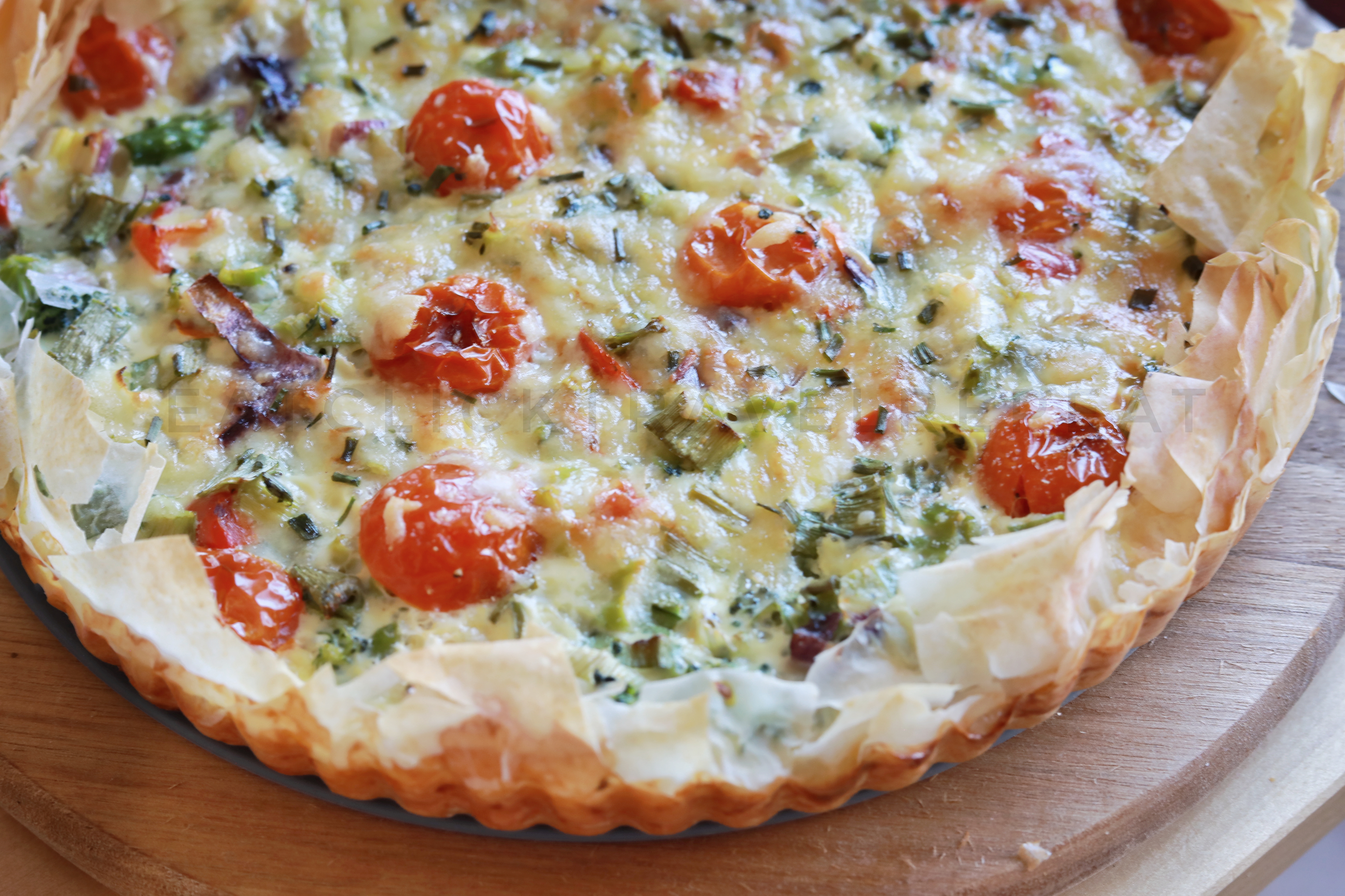 Following the suggestion of Jamie Oliver in his latest quiche recipe on Youtube I used Filo sheets for the base. I was thinking about quiche for a few days and wondered if I had faster way out in avoiding the making of pie base. Some people use readymade pie base or make it from scratch, so when I saw this filo idea, I immediately jumped at the possibility. I had filo sheets lying around since my Apple Strudel recipe. Hence, I decided to use them for the base, which I can assure you has worked out beautifully.