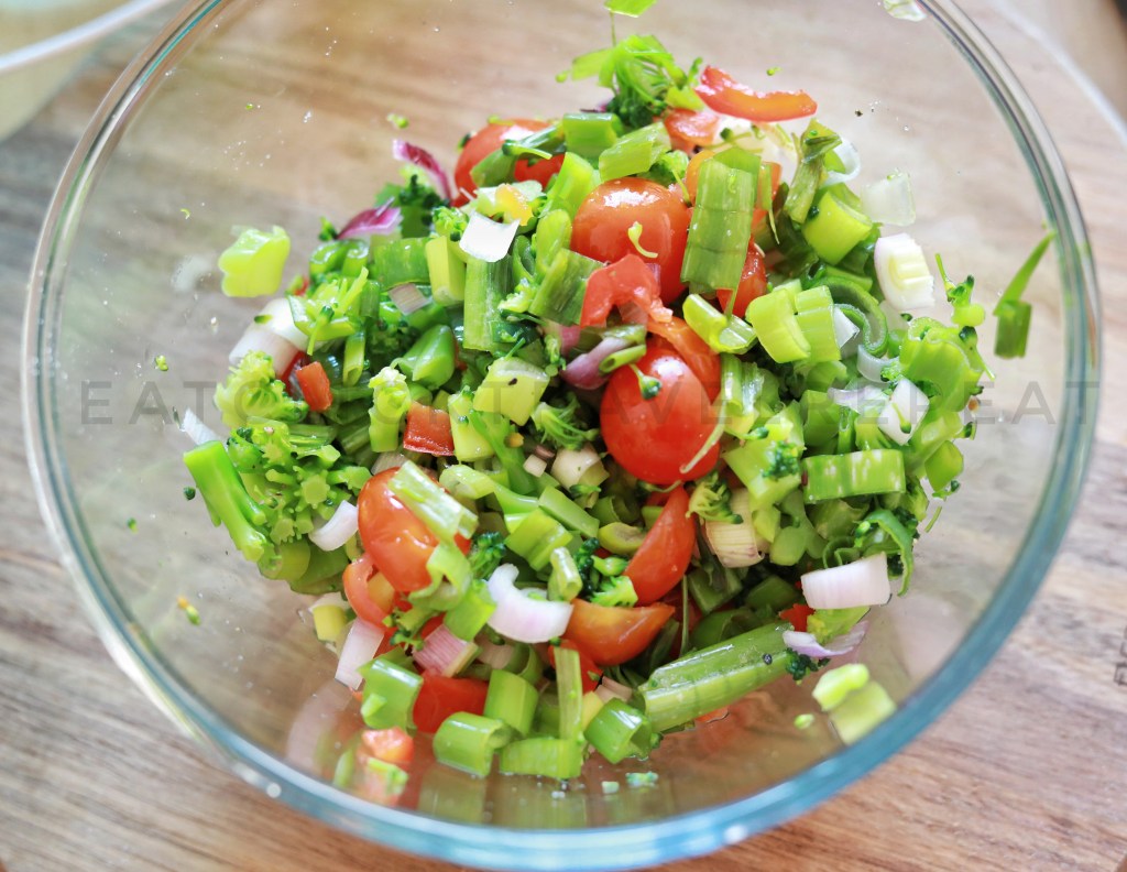 To start off I chopped two whole scallions, half cup of brocoli, half red bell pepper in small dices. I halved the cherry tomatoes and removed the seeds. I added salt and citron pepper and set it aside.