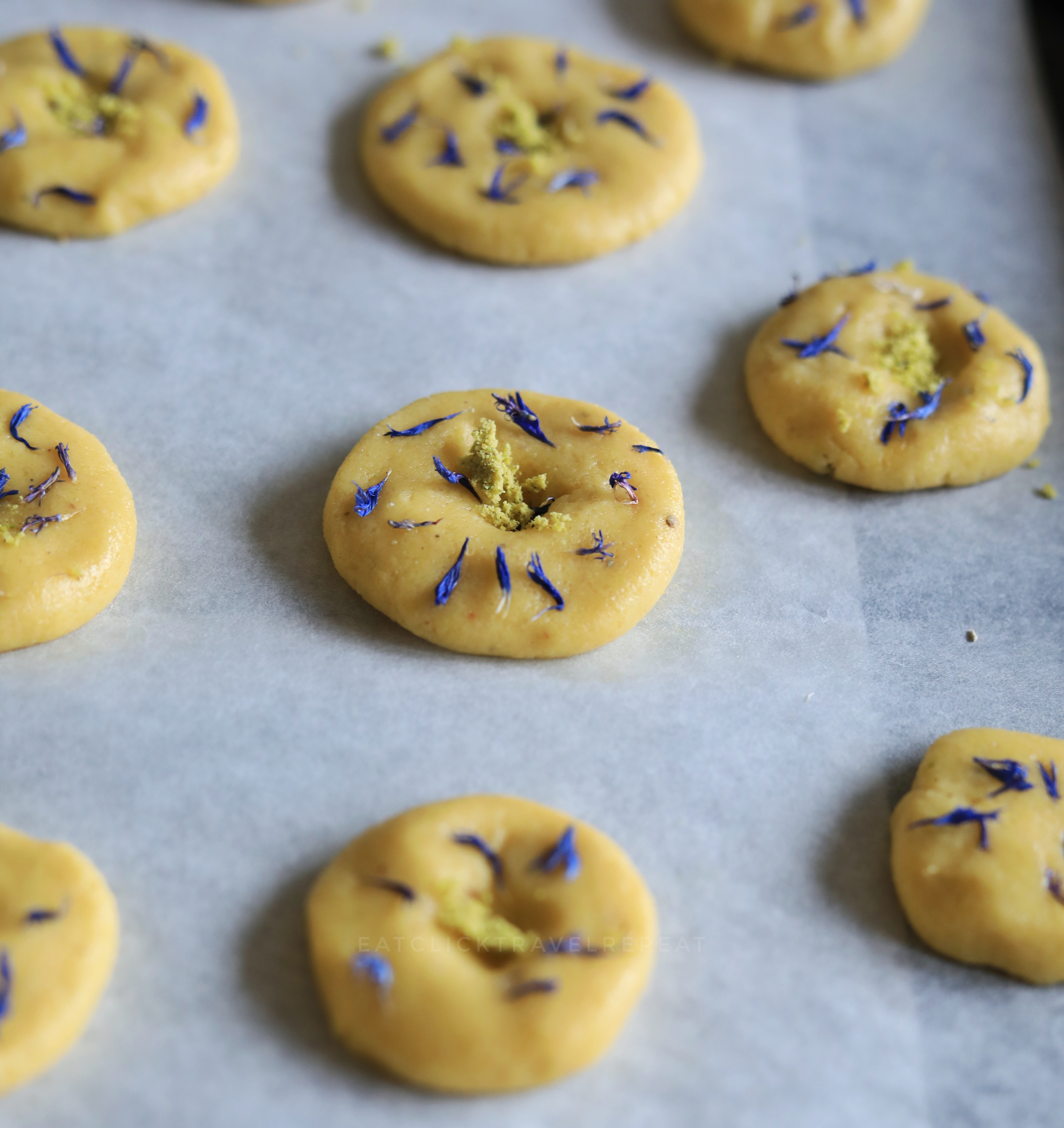 In this version of the recipe I have added pistachio powder, saffron flavor and edible flowers called Blåkint or cornflowers in English. I also added baking powder and baking soda to the original recipe.