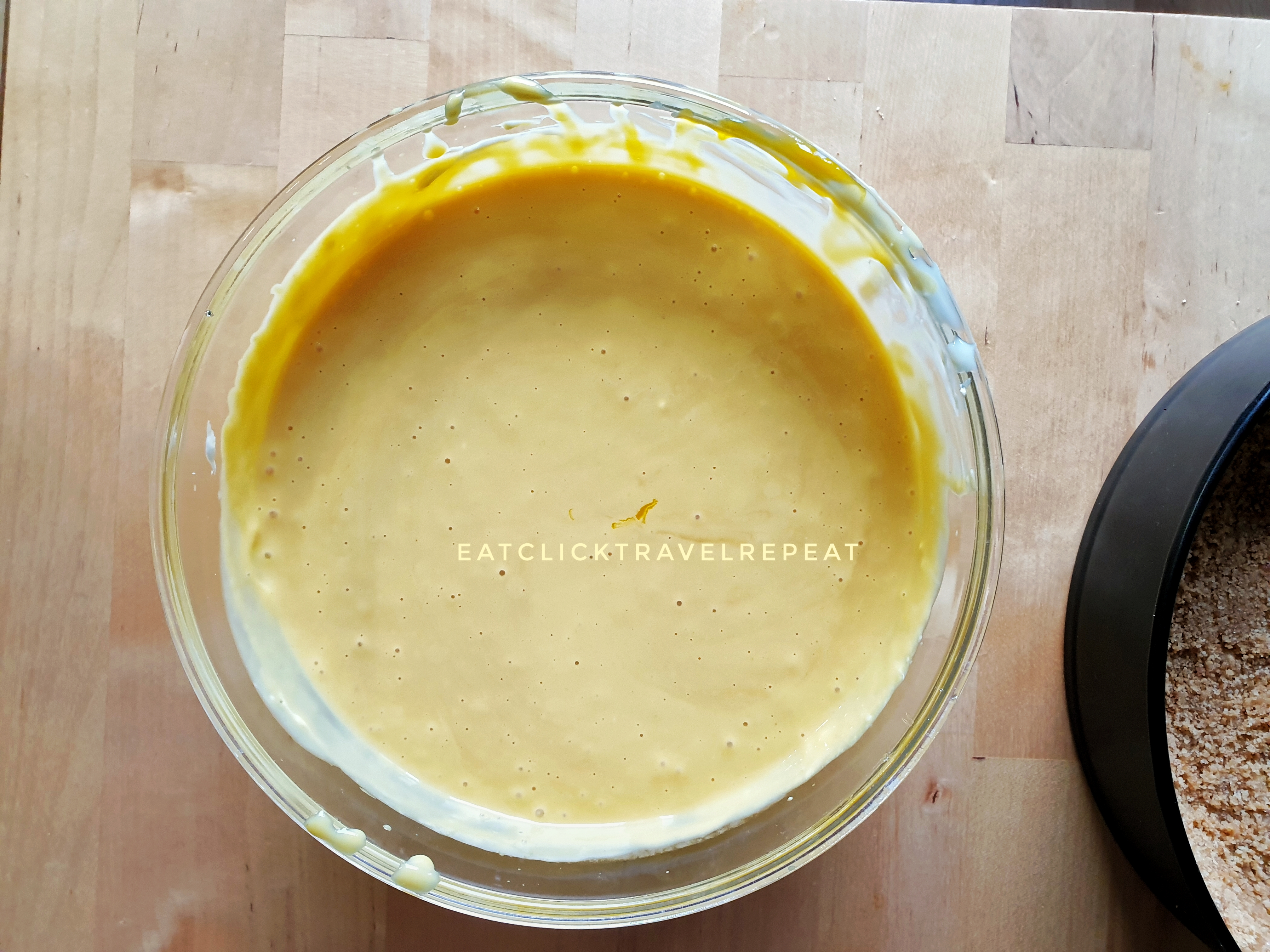 I used an entire 400g Digestive biscuit packet to create a base 23 cm spring form cake tin. Start with crushing the biscuits for the base. Add 200g of molten unsalted butter and 2tbsps of sugar to it and mix it well. Spread it across the base and the sides of the cake tin. Refrigerate the base for 15-20 minutes until you make the batter.